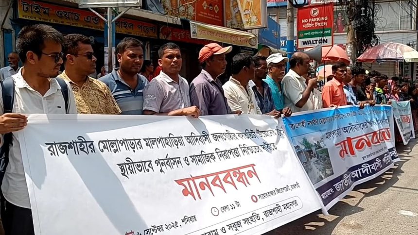 রাজশাহী নগরীর কাশিয়াডাঙ্গা থানাধীন মোল্লাপাড়ায় দীর্ঘদিন ধরে বসবাসরত আদিবাসী সম্প্রদায়ের পরিবারের উচ্ছেদ বন্ধ ও ভূমির পূর্ণ মালিকানা নিশ্চিতের দাবিতে মানববন্ধন অনুষ্ঠিত হয়েছে। শনিবার (৬ সেপ্টেম্বর) বেলা ১১টায় রাজশাহীর সাহেববাজার জিরো পয়েন্টে এ মানববন্ধনের আয়োজন করা হয়।