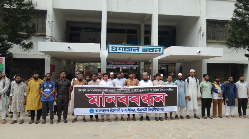 আওয়ামী শাসনামলে ইসলামী বিশ্ববিদ্যালয়ের (ইবি) গুম হওয়া দুই শিক্ষার্থী ওয়ালিউল্লাহ ও আল- মুকাদ্দাসের সন্ধানের দাবিতে মানববন্ধন করেছে শাখা ছাত্রশিবির। শনিবার (৩০ আগস্ট) দুপুর ২ টার দিকে বিশ্ববিদ্যালয়ের প্রশাসন ভবনের সামনে এই মানববন্ধন অনুষ্ঠিত হয়। এসময় ওয়ালিউল্লাহ ও আল- মুকাদ্দাসের সন্ধান, বিশ্ববিদ্যালয় ডিজিটালাইজেশন ও সাজিদ আব্দুল্লাহ’র হত্যার বিচারের দাবি জানান তারা।