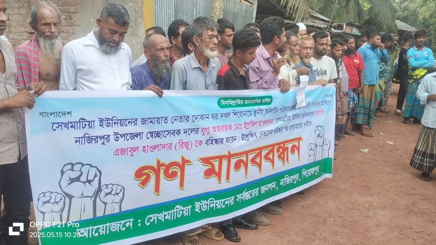 গত ৫ মে দৈনিক আমার দেশ পত্রিকা, কিছু স্থানীয় দৈনিক ও অনলাইন পত্রিকায় নাজিরপুর উপজেলা স্বেচ্ছাসেবক দলের যুগ্ম আহ্বায়ক ও তার বড় ভাই সেখমাটিয়া ইউনিয়ন শ্রমিক দলের সভাপতি মো: এজাবুল হাওলাদারের বিরুদ্ধে জামায়াত নেতার দোকান দখল করে বিএনপি ও অঙ্গ সহযোগী সংগঠনের অফিস উদ্বোধন শীর্ষক সংবাদ প্রকাশিত হয়। উক্ত সংবাদ প্রচারের প্রতিবাদে ও বহিষ্কারাদেশ প্রত্যাহারের দাবীতে মানববন্ধন করেছে স্থানীয় জনগন।