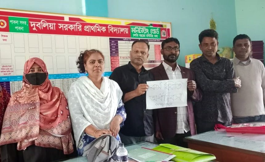 পাবনায় প্রাথমিক সহকারী শিক্ষকদের কর্মবিরতি চলছে, ক্ষুব্ধ অভিভাবকরা