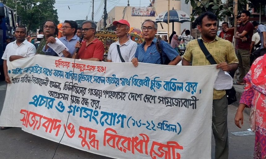 ফলে গার্মেন্টসসহ দেশীয় শিল্প, কৃষি খাত ও ঔষধ শিল্প মারাত্মক প্রতিযোগিতার মুখে পড়বে এবং বিপুল সংখ্যক মানুষ বেকার হবে। সাম্রাজ্যবাদ ও যুদ্ধ বিরোধ জোটের প্রচার সপ্তাহে ষষ্ঠ দিনে আগামীকাল মঙ্গলবার বিকাল ৫টায় লালবাগ আজিমপুর সুপার মার্কেট জমায়েত হয়ে গণসংযোগ ও প্রচার এবং একই সময়ে বনানী মহাখালী ওয়ারলেস গেইটে জমায়েত হয়ে প্রচার, গণসংযোগ, লিফলেট বিলি ও পথসভা অনুষ্ঠিত হবে।