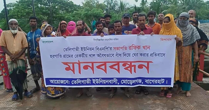 বাগেরহাটের মোড়েলগঞ্জ উপজেলার তেলিগাতী ইউনিয়নের হরগাতি স্লুইসগেট থেকে পানি নিষ্কাশনের দাবিতে মানববন্ধন করেছেন স্থানীয় বাসিন্দারা। অতিবৃষ্টি ও জোয়ারের পানিতে ঘরবাড়ি ও জমি প্লাবিত হওয়ায় মঙ্গলবার বিকেলে হরগাতি স্লুইসগেট সংলগ্ন এলাকায় এ মানববন্ধন কর্মসূচি পালন করা হয়।